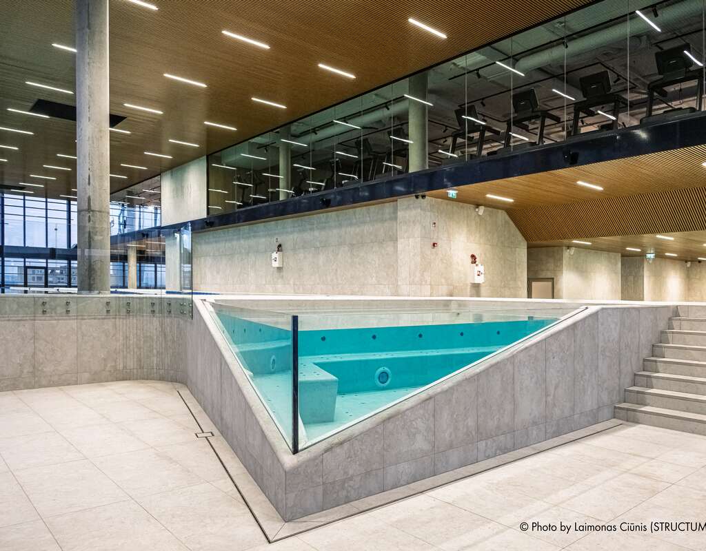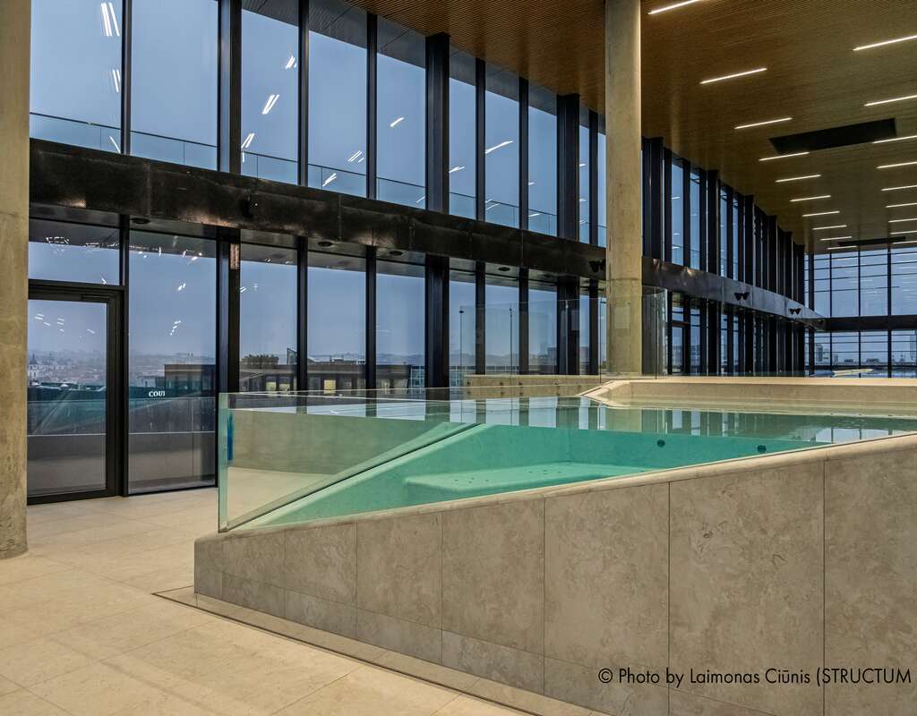 This is a unique project, the like of which is unequaled in Lithuania. The building has a complex construction and the swimming pool with Spa area is located at the top on the eighth floor and protrudes from the building and hangs like a balcony to the slab.